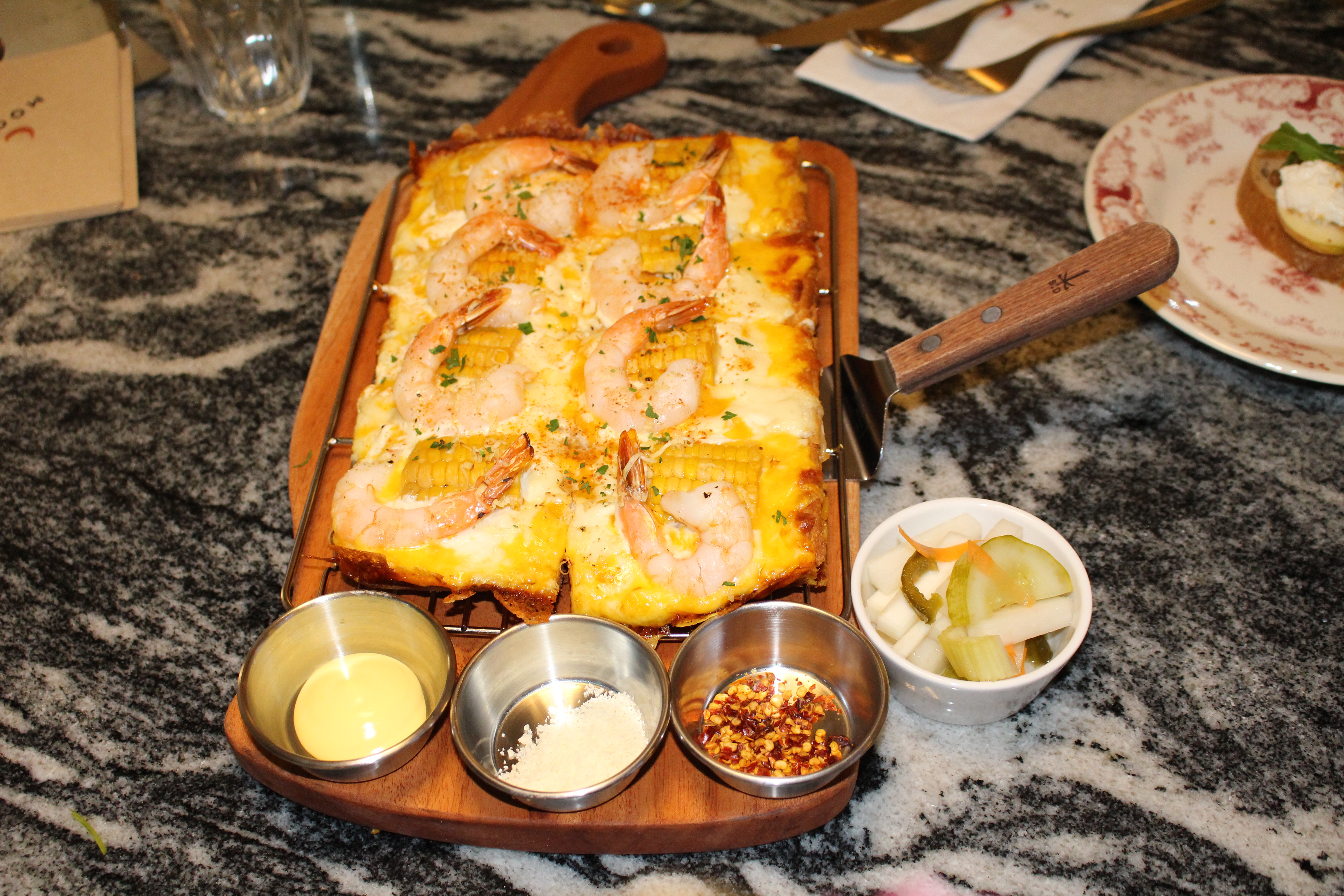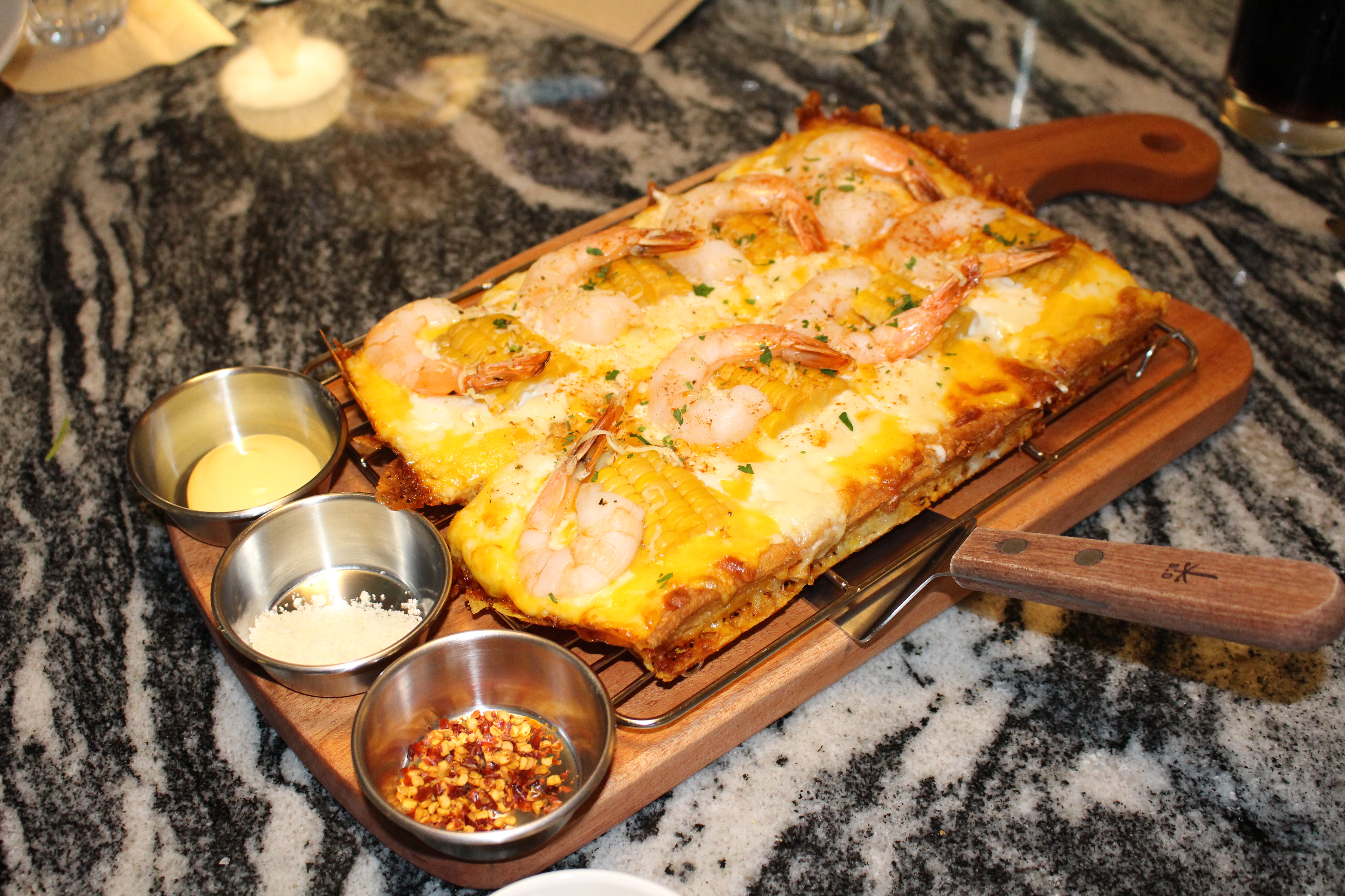 애피타이져를 먹었으니 이제는 본격적인 메인 메뉴인 콘&쉬림프 피자 먹어 봅니다. 일단 비주얼이 통통한 새우에 콘과 치즈의 조합으로 너무 비주얼이 맛있어 보이네요~