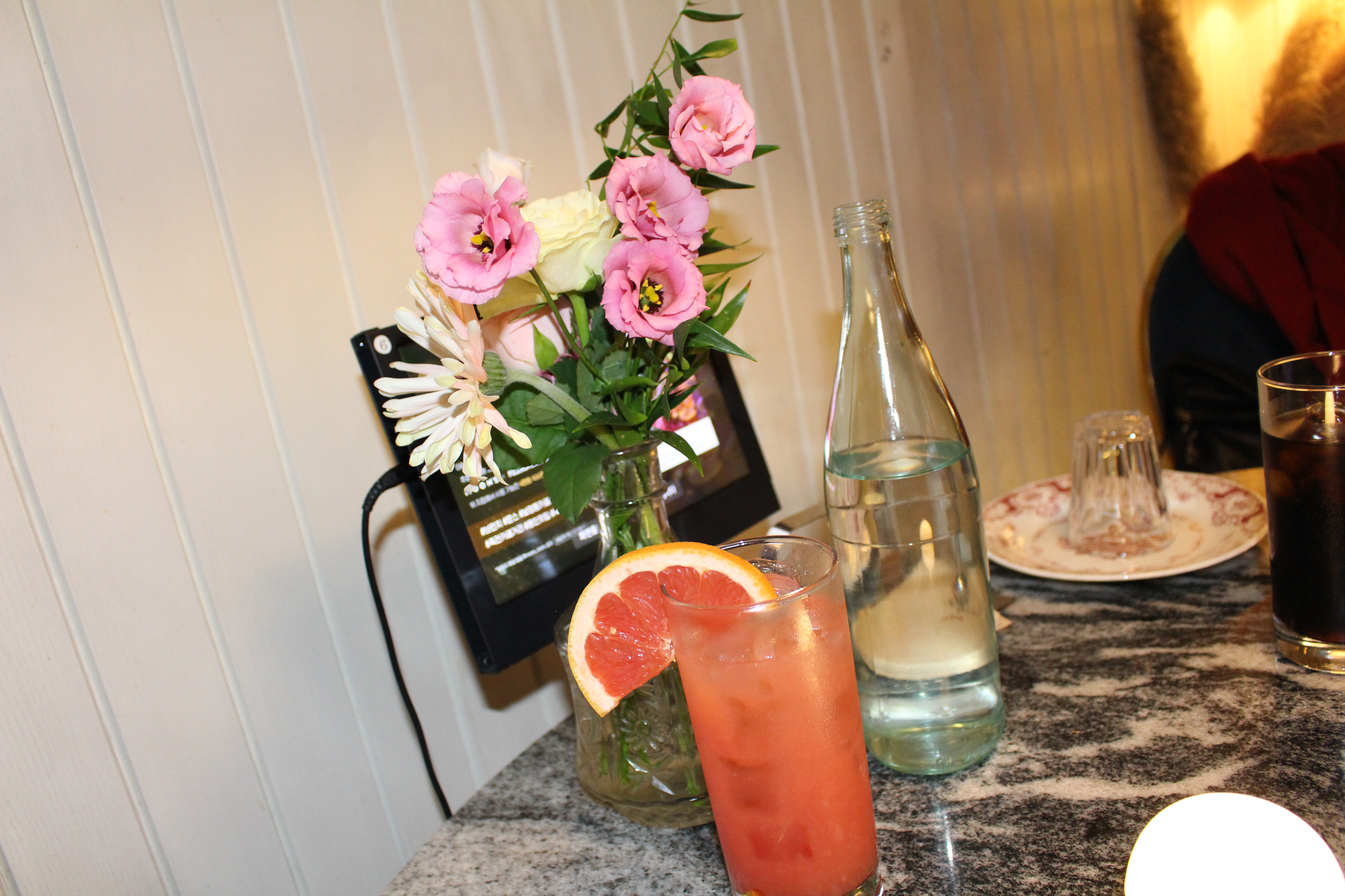 참 요즘에는 보기 드문 생화 꽃병도 테이블마다 이렇게 이쁘게 놓여 있고~ 세트메뉴를 주문했는데 세트 메뉴에 음료가 포함되어 음료가 먼저 나왔습니다. 생과일 자몽 주스~