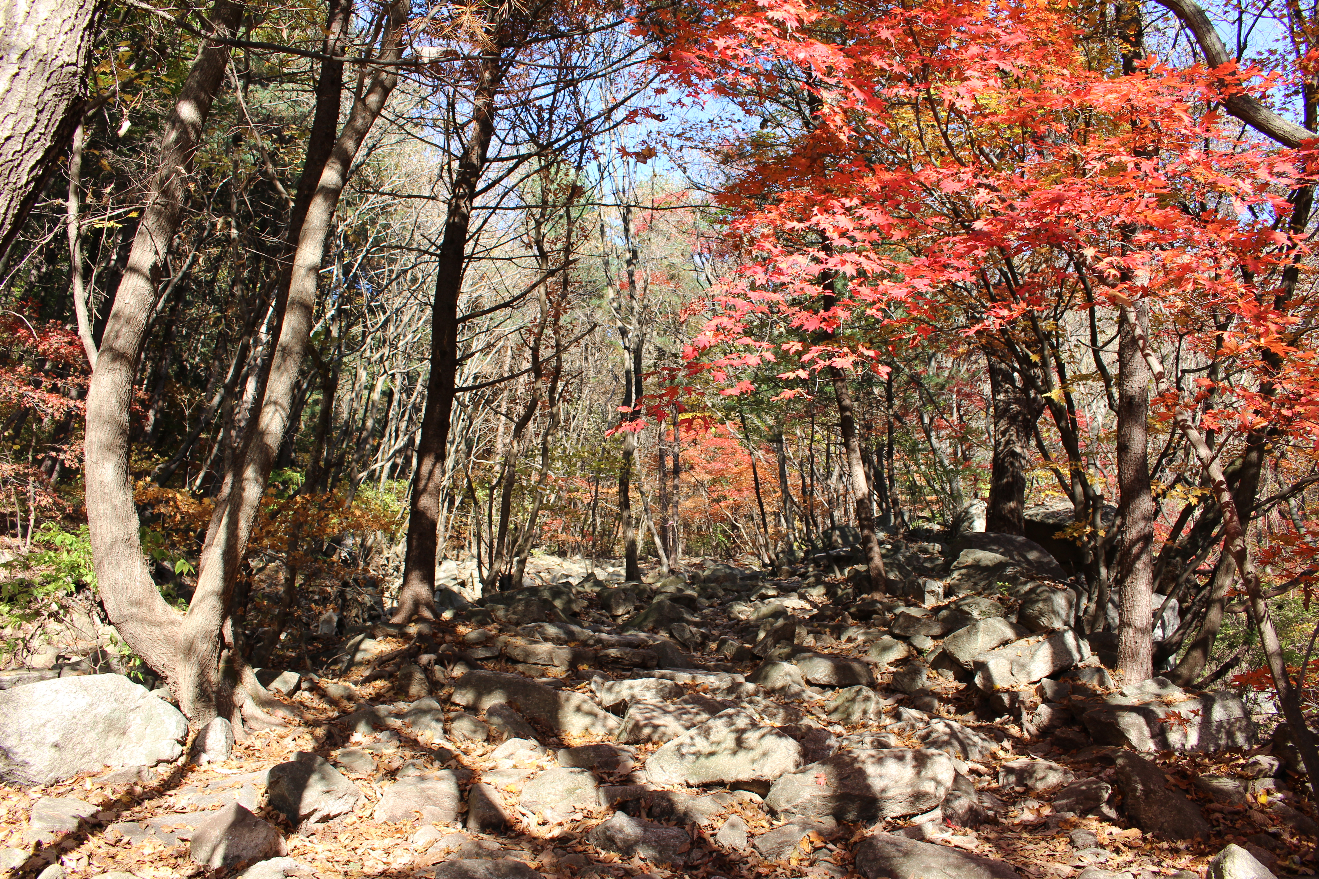 법륜사로부터 약 2~30분 정도 산행을 하면 이후부터는 이런 너덜 길이 시작되는데 감악산 정상까지 계속될 만큼 너덜 길이 정말로 끝없이 이어집니다. 단풍은 시기가 조금 지난 것 같습니다. 등상로 주변에 있는 단풍나무에는 벌써 단풍이 많이 떨어졌습니다.