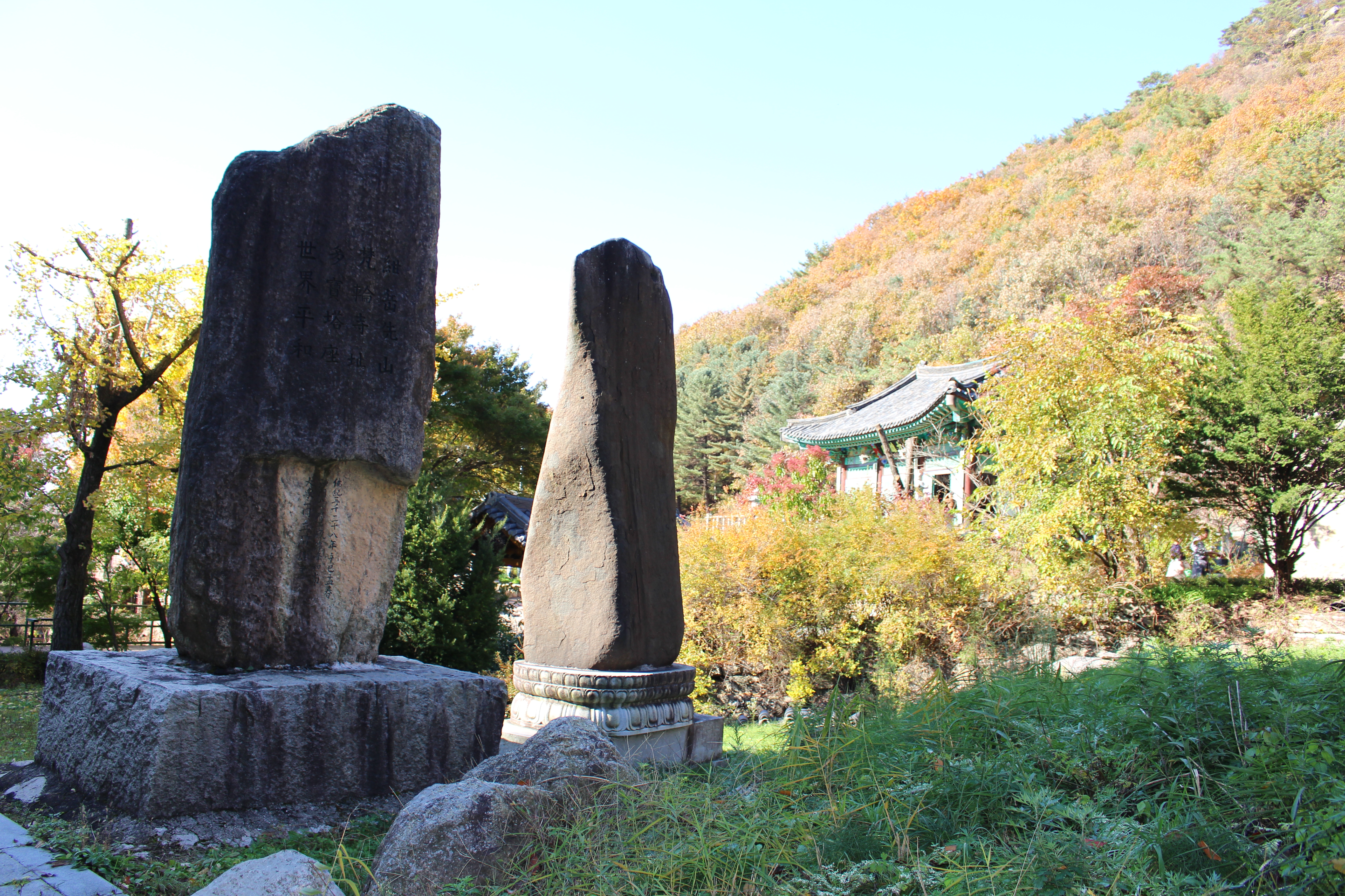 법륜사를 지나면 이제부터 감악산의 등산이 시작된다고 생각하시면 됩니다. 무슨 의미의 비석인지는 모르겠는데 몇 개가 있으며 비석 뒤로는 법륜사가 조망됩니다.